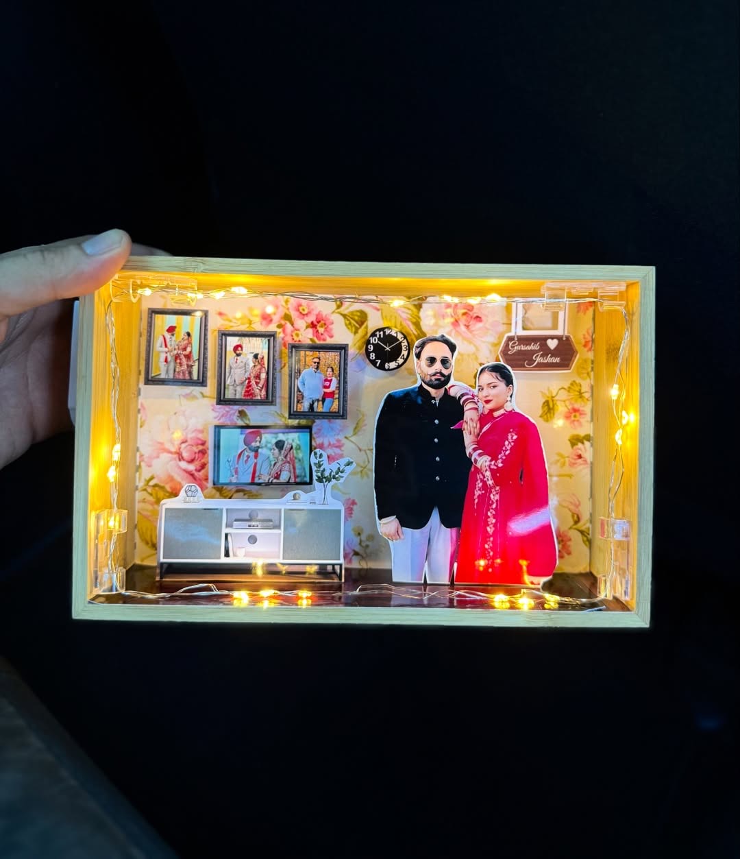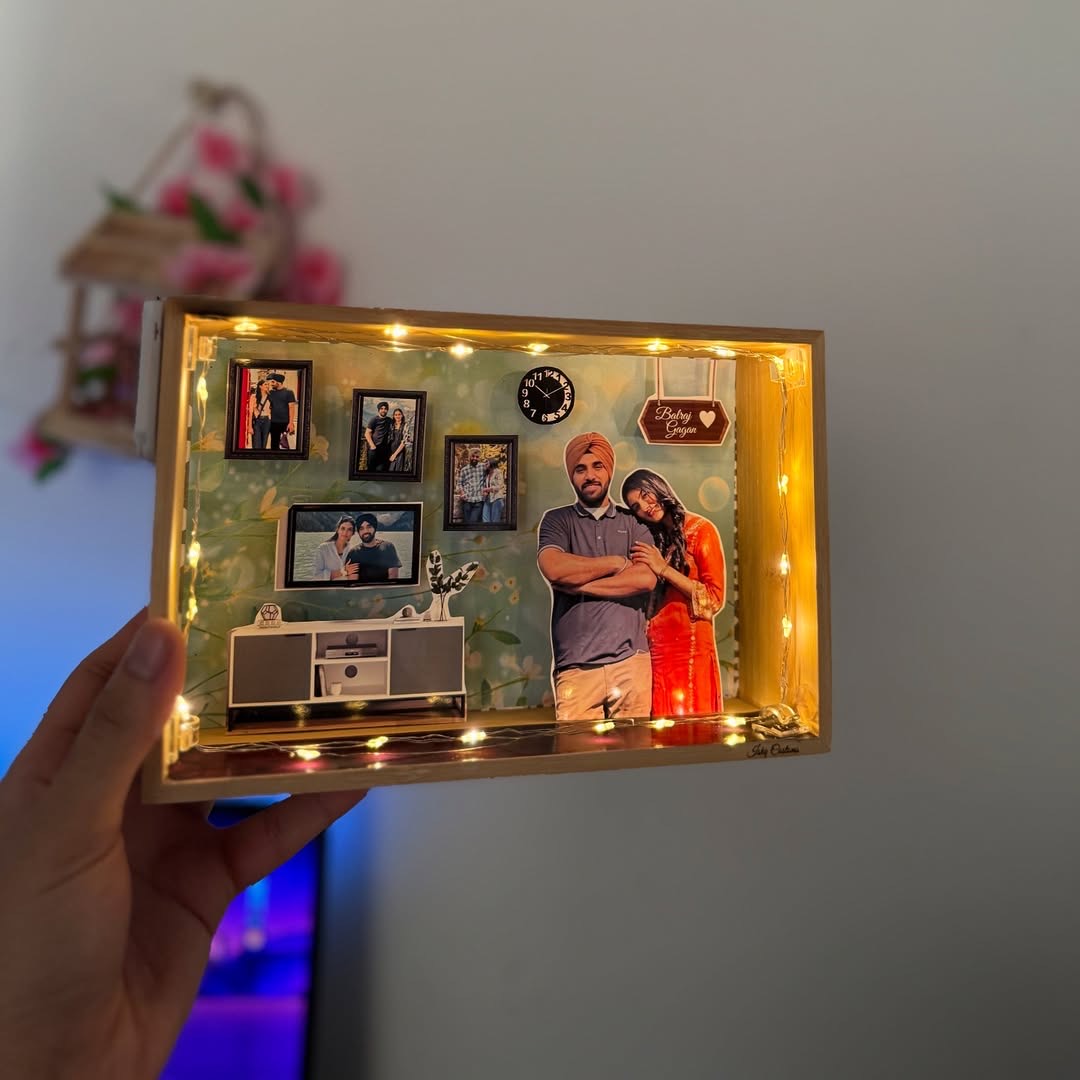 Each frame is created using high-quality materials and your selected photos. The open concept design keeps everything clearly visible, showing photos, small decorative details, and soft LED lights that give a warm and cozy look. It’s perfect for couple photos, family memories, or any special occasion.
